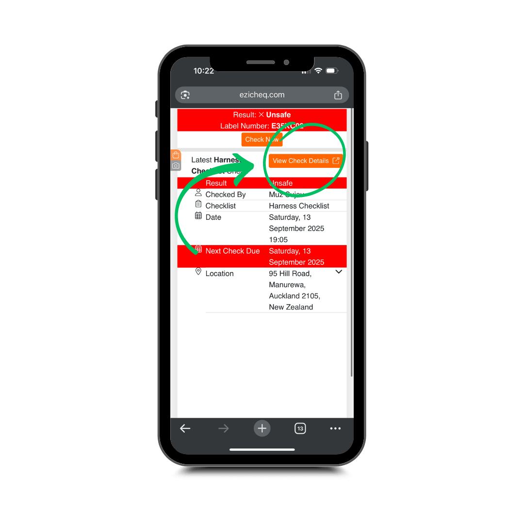 Instantly access the last check report directly from the item page. Simply go to Next Check Due > click View Check Details to view the report and export it as a PDF. Faster access, less admin and full coverage.