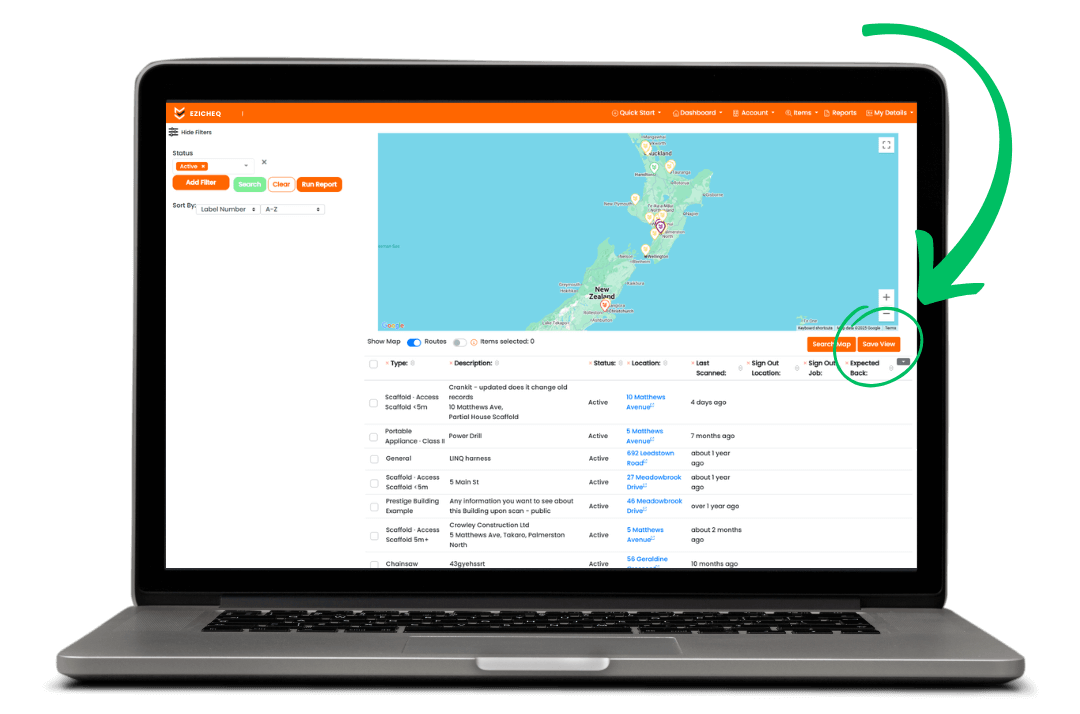 On the items list page, you can now save your personal view. Customise your columns, map locations, and preferred setup, then click save — ensuring your presets load automatically every time you log into EZICHEQ.